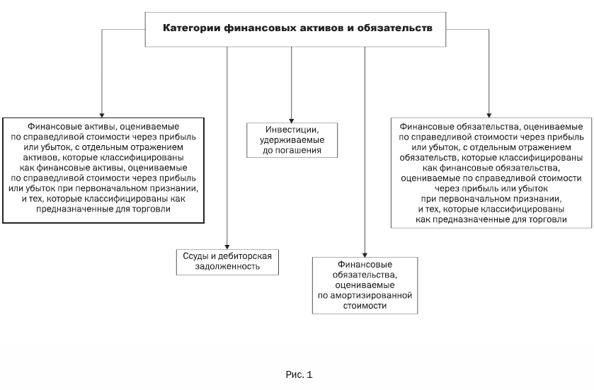 Необходимо отражать балансовую стоимость финансовых активов и финансовых обязательств по категориям, сформированным на основе принципов оценки по МСФО (IAS) 39 «Финансовые инструменты — признание и оценка» (финансовые активы, удерживаемые до погашения, финансовые инструменты, имеющиеся в наличии для продажи, отражаемые по справедливой стоимости через счета прибылей и убытков, кредиты и авансы выданные и др.) (рис. 1).